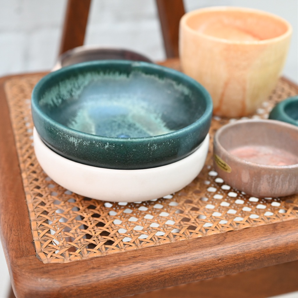 独自の釉薬を使い、丁寧に一つずつ釜で焼かれたアイテムは、火の当たる箇所や温度、その日の温度や湿度によって全てが再現する事ができない一点ものに。